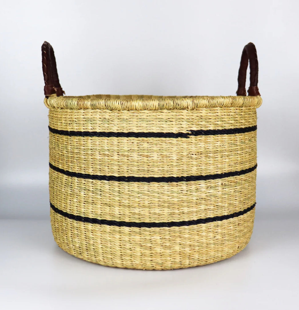 This handwoven Storage basket is made in the North of Ghana by a group of self taught women in Bolgatanga. This strong traditional Bolga basket can be used indoors for storage of log, toys, magazines, laundry, throws etc... It will enhance your room as well as serving the purpose. It has a strong handle grip which makes it easy to carry around the house.